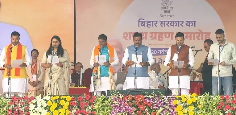 समारोह में सम्राट चौधरी और विजय कुमार सिन्हा को डिप्टी सीएम के रूप में शपथ दिलाई गई। इस बार कुल 26 विधायक मंत्री पद की शपथ लेंगे। इनमें से जदयू के 8, भाजपा के 14, लोजपा (आर) के 2 और रालोमो और हम के एक-एक मंत्री होंगे।