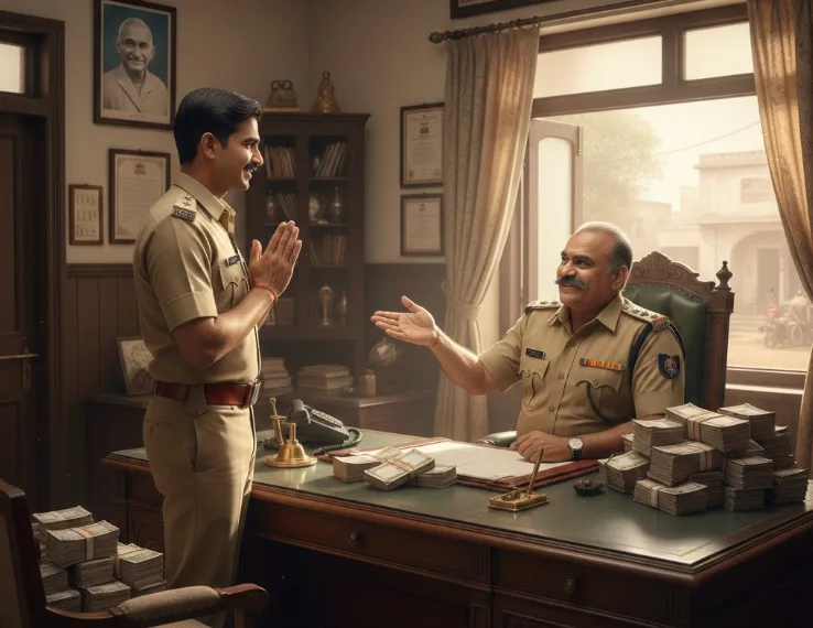 कमरे में दाखिल होते ही सलाम ठोंका और चुपचाप 5 लाख मेज पर रख दिए। साहब का पारा चढ़ गया, "रिश्वत देते हो? हिम्मत कैसे हुई?" तुरंत आदेश दिया कि "इसे कमरे में बंद करो।" थानेदार भी कम घुटा हुआ नहीं था।