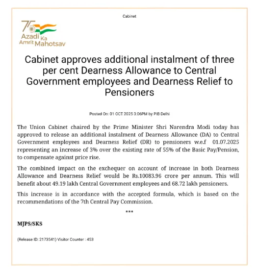 केंद्रीय कर्मचारियों के लिए एक अच्छी खबर आई है। दिवाली और दशहरे से पहले कैबिनेट ने महंगाई भत्ते (DA Hike) में 3 प्रतिशत की बढ़ोतरी को मंजूरी दे दी है। बुधवार को हुई बैठक में यह फैसला लिया गया कि अब केंद्रीय कर्मचारियों और पेंशनभोगियों को 55 प्रतिशत के बजाय 58 प्रतिशत महंगाई भत्ता मिलेगा। ये बढ़ोतरी 1 जुलाई, 2025 से लागू होगी।