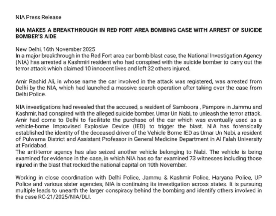 आमिर दिल्ली इसलिए आया था ताकि कार खरीदने में मदद कर सके। बाद में उसी कार को धमाके के लिए आईईडी के तौर पर इस्तेमाल किया गया। दिल्ली ब्लास्ट मामले की जांच पहले दिल्ली पुलिस कर रही थी। बाद में ये केस एनआईए को सौंपा गया। एनआईए ने केस संभालने के बाद बड़ी तलाशी अभियान शुरू किया।