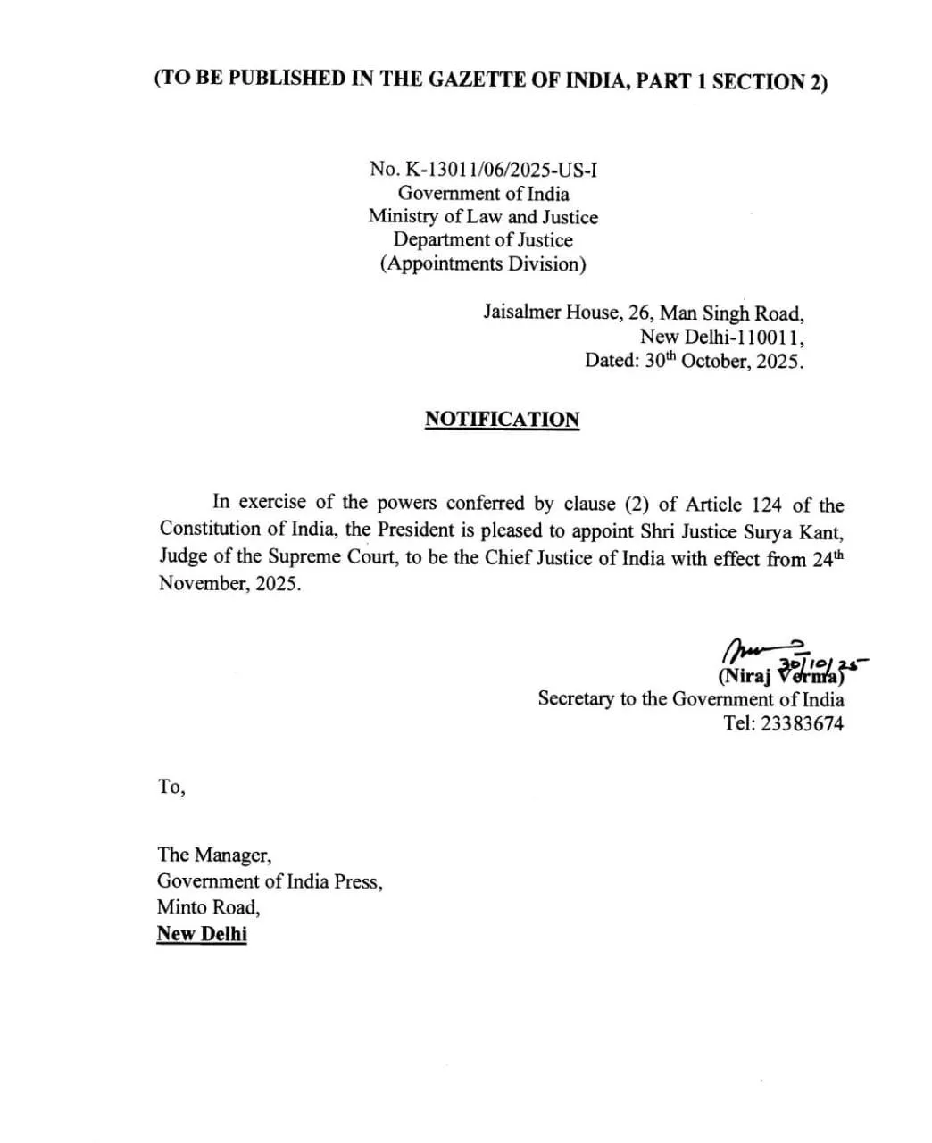 In exercise of the powers conferred by the Constitution of India, the President is pleased to appoint Shri Justice Surya Kant, Judge of the Supreme Court of India as the Chief Justice of India with effect from 24th November, 2025.