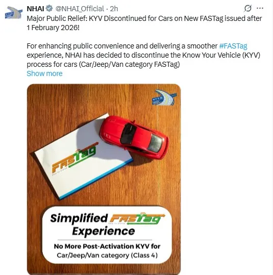 1 फरवरी 2026 से नए फास्टैग के लिए KYV जरूरी नहीं होगा।