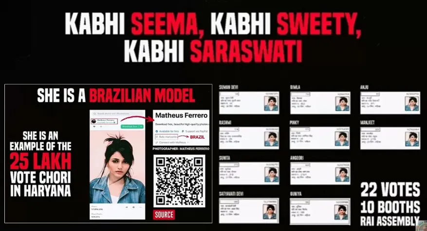 राहुल इस दौरान एक लड़की की फोटो दिखाते हैं और कहते हैं कि इस लड़की ने अलग-अलग नाम से 22 जगह वोट डाले। इसके नाम से 22 वोटर आईडी कार्ड बने हुए हैं। कहीं इसका नाम सीमा है, तो कहीं स्वीटी। असल में ये ब्राजील की मॉडल है, जिसकी फोटो का इस्तेमाल किया गया।