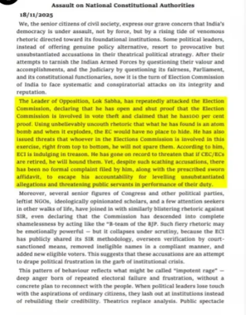 सिग्नेटरीज ने कहा कि विपक्षी दलों की आलोचना चयनात्मक है। जब विपक्ष को अनुकूल परिणाम मिलते हैं, EC की आलोचना नहीं होती। प्रतिकूल परिणामों पर आयोग को "विलेन" बना दिया जाता है। यह सेलेक्टिव आक्रोश राजनीतिक अवसरवाद को दिखाता है।