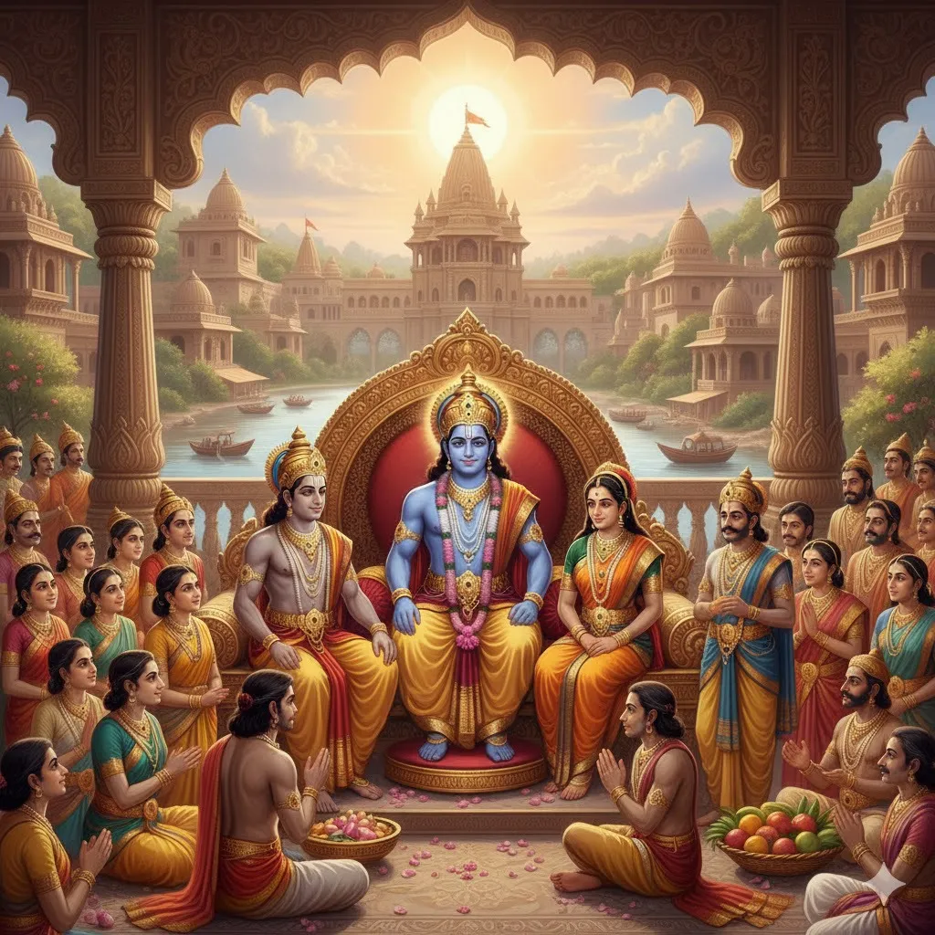 अब अयोध्या में राम राज लौट आया था। उनके राज्य में चंद्रमा ने अपनी अमृतमयी किरणों से पृथ्वी को पूर्ण कर दिया। सूर्य उतना ही तपते, जितनी जरूरत होती। बादल भी उतने ही बरसते, जितनी आवश्यकता होती थी। रोज सभा लगती। एक दिन राम जी ने सभी अयोध्यावासियों को नीतिगत उपदेश दिया। नारद जी ने भी आकर राम जी का आशीर्वाद लिया और ब्रह्मलोक को चले गए।