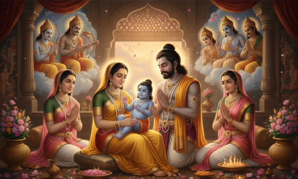 भगवान प्रकट हुए। उनका श्याम शरीर था। पूरा संसार भक्ति में लीन हो गया। गुरु वशिष्ठ के पास बुलावा भेजा गया। वे राजद्वार पहुंचे। दशरथ ने जातकर्म-संस्कार किए। ब्राह्मणों को सोना, गो, वस्त्र और मणियों का दान दिया। इसके बाद कैकेयी और सुमित्रा ने सुंदर पुत्रों को जन्म दिया। कुछ दिन बाद नामकरण संस्कार हुआ। राजा दशरथ के सबसे बड़े पुत्र का नाम राम रखा गया। दूसरे पुत्र का नाम भरत, तीसरे का लक्ष्मण और चौथे पुत्र का नाम शत्रुघ्न रखा गया। समय बीतता गया और भगवान बड़े होते गए। शिक्षा, शास्त्र और शस्त्र में पारंगत होते गए।