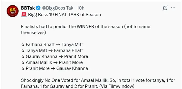 मालती चाहर के एविक्शन के बाद अब अमाल मलिक, तान्या मित्तल, गौरव खन्ना, प्रणित मोरे और फरहाना भट्ट के बीच ट्रॉफी की जंग है। ये लिस्ट सोशल मीडिया पर खूब वायरल हो रही है।