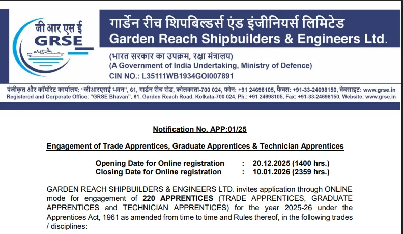 GRSE भर्ती को 5 पॉइंट में समझेंGRSE ने 10वीं पास, ITI, डिप्लोमा, और B.E/B.Tech डिग्री वालों के लिए भर्ती निकाली है। भर्ती के लिए अधिकतम आयु 26 वर्ष है, कैटेगरी के अनुसार छूट भी मिलेगी। इस भर्ती के लिए उम्मीदवारों का सिलेक्शन मेरिट लिस्ट के आधार पर होगा। सिलेक्ट उम्मीदवारों को ट्रेनिंग के दौरान हर महीने 15 हजार रुपए का स्टाइपेंड दिया जाएगा। आवेदन 20 दिसंबर से शुरू हो चुके हैं और 10 जनवरी 2026 आखिरी तारीख है। | |