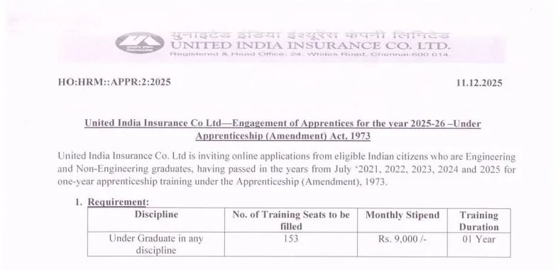सरकारी नौकरी का सपना देख रहे युवाओं के लिए अच्छी खबर है। यूनाइटेड इंडिया इंश्योरेंस कंपनी लिमिटेड ने नई भर्ती निकाली है। यहां अप्रेंटिस के कुल 153 पदों को भरा जाएगा। इसके लिए आवेदन प्रक्रिया 18 दिसंबर 2025 से शुरू हो चुकी है। सबसे अच्छी बात यह है कि आवेदन बिल्कुल फ्री है। भर्ती से जुड़ी जरूरी जानकारी नीचे विस्तार से दी गई है।