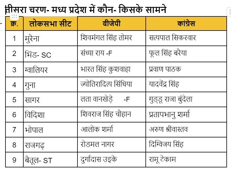 लोकसभा चुनाव के तीसरे चरण में मध्य प्रदेश की 9 सीटों पर वोटिंग आज है। सुबह 7 बजे से शाम 6 बजे तक मतदान होगा। इनमें मुरैना, भिंड, ग्वालियर, गुना, राजगढ़, विदिशा, सागर, बैतूल और भोपाल सीट शामिल हैं। 9 सीटों पर 127 प्रत्याशी मैदान में हैं। जिनकी किस्मत का फैसला एक करोड़ 77 लाख 52 हजार 583 मतदाता करेंगे।