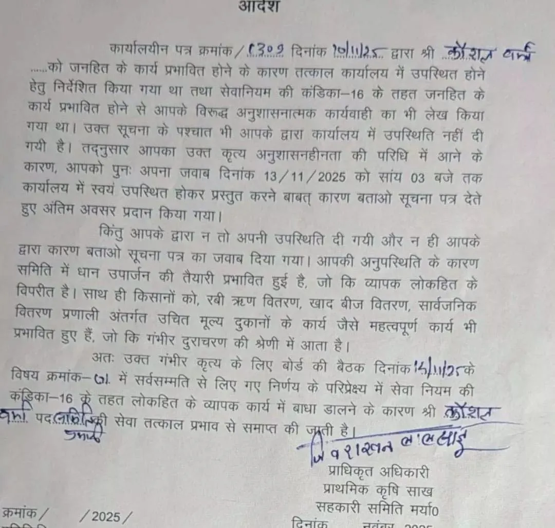 वर्मा की लगातार अनुपस्थिति से धान उपार्जन और अन्य महत्वपूर्ण कार्य प्रभावित हुए। समिति ने वर्मा की अनुपस्थिति को लोकहित के विपरीत और गंभीर दुराचरण माना। बोर्ड की बैठक के निर्णय के अनुसार वर्मा को पद से हटाने का आदेश जारी किया गया। सेवा नियमों के तहत कार्रवाई करते हुए वर्मा को तुरंत प्रभाव से हटाया गया है।