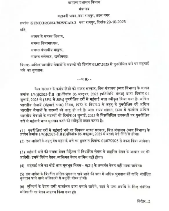 RAIPUR. छत्तीसगढ़ सरकार ने हाल ही में एक बड़ा फैसला लिया है, जो IAS और IPS अफसरों की सैलरी से जुड़ा है। नवा रायपुर के सामान्य प्रशासन विभाग ने इन अफसरों के महंगाई भत्ते (DA) को 55% से बढ़ाकर 58% कर दिया है। इसका मतलब ये हुआ कि अब इन अफसरों की सैलरी में 1600 रूपए से लेकर 5000 रूपए तक का इजाफा हो जाएगा।