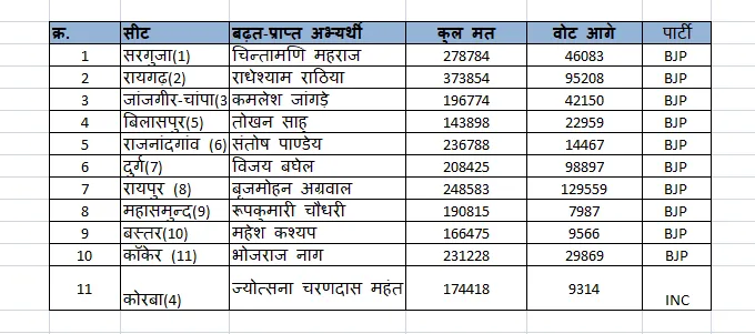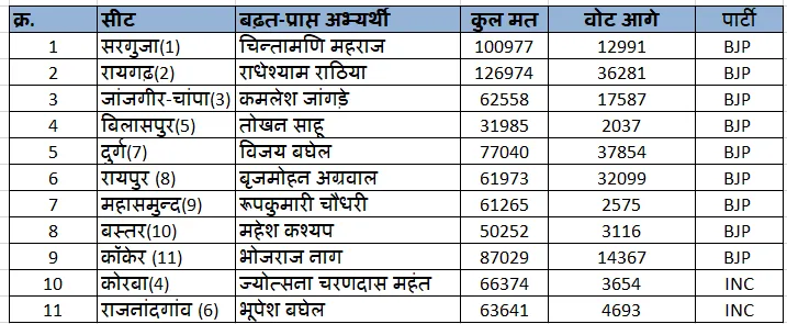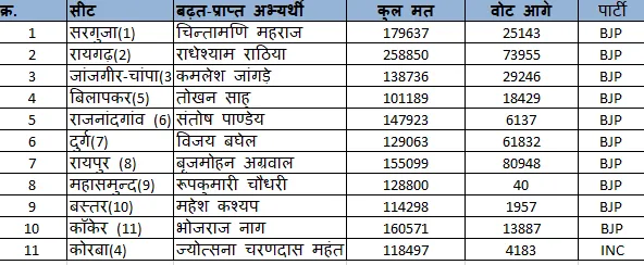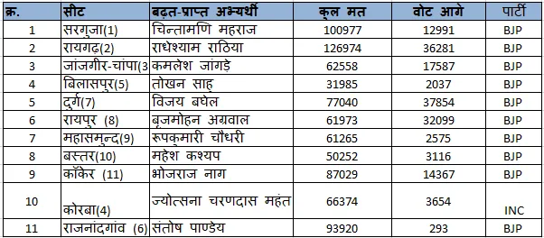 10 सीट पर BJP और कोरबा में कांग्रेस आगे