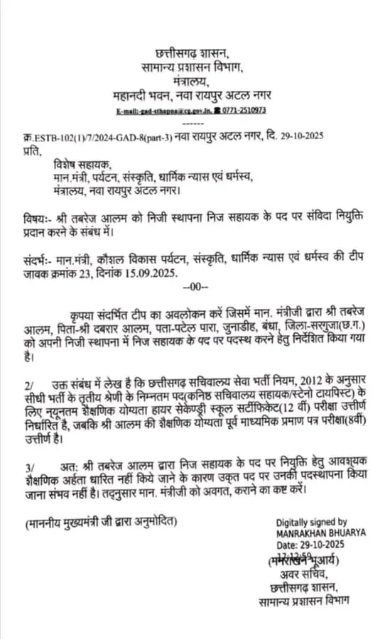 मंत्री ने जीएडी को यह निर्देश दिया था कि तबरेज आलम को उनकी निजी स्थापना में निज सहायक के पद पर रखा जाए। लेकिन सामान्य प्रशासन विभाग ने छत्तीसगढ़ सचिवालय सेवा भर्ती नियमों का हवाला देते हुए उन्हें एक पत्र भेजा। इस पत्र में बताया गया कि सीधी भर्ती के तृतीय श्रेणी के पद के लिए न्यूनतम शैक्षणिक योग्यता 12वीं पास होनी चाहिए। पत्र में यह भी कहा गया कि तबरेज आलम की शैक्षणिक योग्यता सिर्फ आठवीं पास है, इसलिए उन्हें निज सहायक के पद पर पदस्थापित करना संभव नहीं है।
