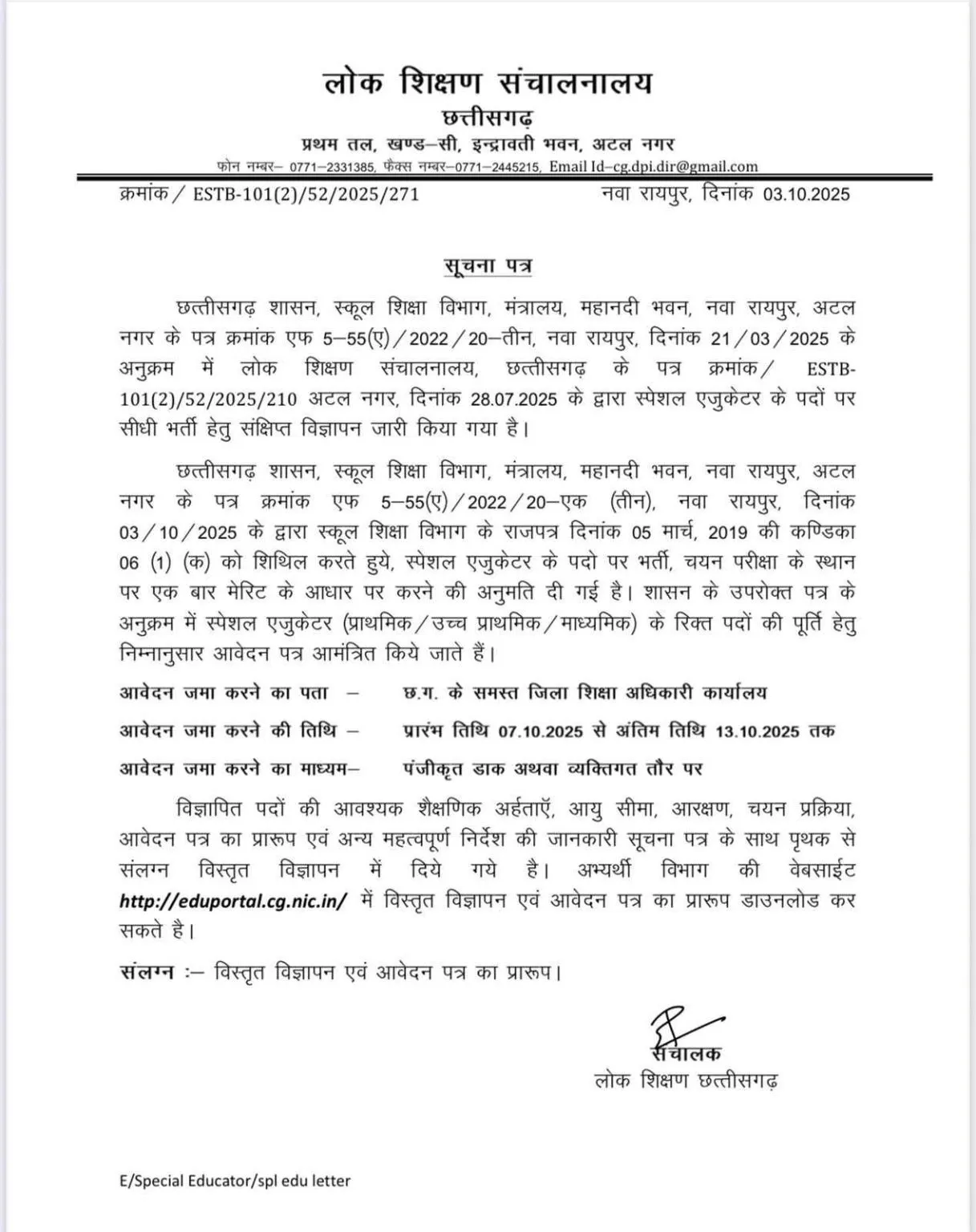 छत्तीसगढ़ के बेरोजगार युवाओं के लिए यह एक सुनहरा मौका है! छत्तीसगढ़ सरकार ने सरकारी स्कूलों में छत्तीसगढ़ स्पेशल एजुकेटर भर्ती के लिए अधिसूचना (Notification) जारी कर दी है। यह भर्ती प्राथमिक (Primary), उच्च प्राथमिक (Upper Primary) एवं माध्यमिक स्तर (Secondary Level) पर 100 रिक्त पदों को भरने के लिए की जा रही है। यह निर्णय न केवल योग्य उम्मीदवारों को रोजगार प्रदान करेगा, बल्कि प्रदेश के सरकारी स्कूलों में विशेष आवश्यकता वाले बच्चों (Children with Special Needs - CWSN) की शिक्षा की गुणवत्ता को भी मजबूत करेगा।
