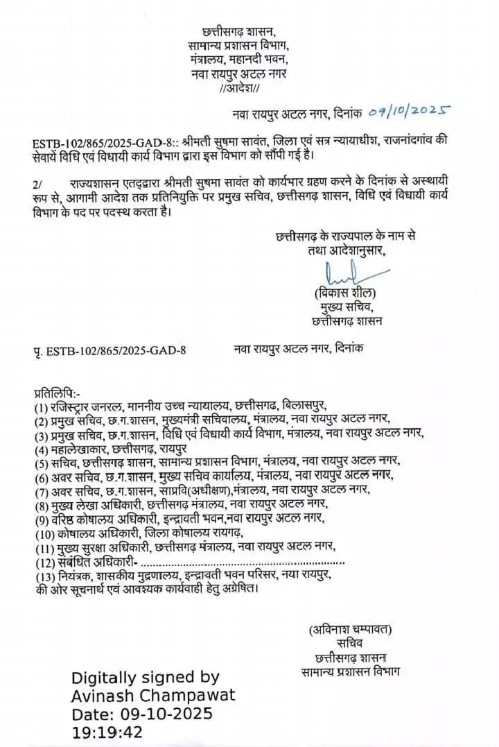 आदेश के तहत सुप्रभा सावंत को जिला एवं सत्र न्यायाधीश, राजनांदगांव की सेवाओं से अस्थायी रूप से प्रधान सचिव, छत्तीसगढ़ शासन, विधि एवं विधायी कार्य विभाग में नियुक्त किया गया है। राज्य शासन के आदेशानुसार, सुप्रभा सावंत को कार्यभार ग्रहण करने से आगामी आदेश तक प्रतिनियुक्ति पर यह पदभार दिया गया है। इस नियुक्ति का उद्देश्य विधि एवं विधायी कार्य विभाग के संचालन को सुदृढ़ करना और विभागीय कार्यों में कुशल नेतृत्व सुनिश्चित करना बताया गया है।