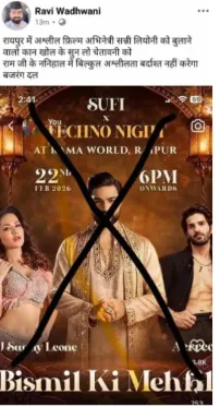 बॉलीवुड एक्ट्रेस सनी लियोनी 22 फरवरी को रायपुर के रामा वर्ल्ड में एक नाइट डीजे पार्टी में शामिल होने वाली हैं। कार्यक्रम के अनाउंसमेंट का वीडियो सोशल मीडिया पर खूब वायरल हो रहा है। इस वीडियो को देखने के बाद बजरंग दल ने भी इसका विरोध करना शुरू कर दिया है।