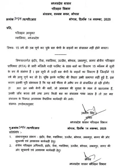 मध्य प्रदेश के परिवहन सचिव मनीष सिंह ने प्रदेश के परिवहन आयुक्त विवेक शर्मा को एक पत्र लिखा है। इसमें इन पुरानी बसों को लेकर तुरंत कार्रवाई करने के आदेश दिए गए हैं। पत्र में कहा गया है कि ये सभी बसें अब 15 साल से ज्यादा पुरानी हो चुकी हैं। इनकी उम्र भी पूरी हो गई है।