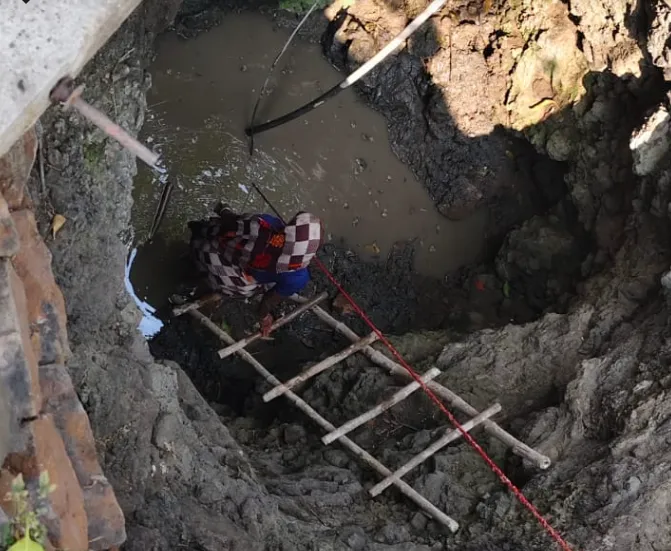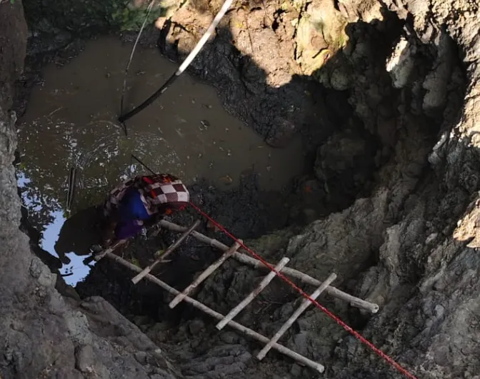- ग्रामीण 20 फीट गहरे कुएं में सीढ़ी लगाकर उतरते हैं और कीचड़ वाला पानी निकालते हैं।
