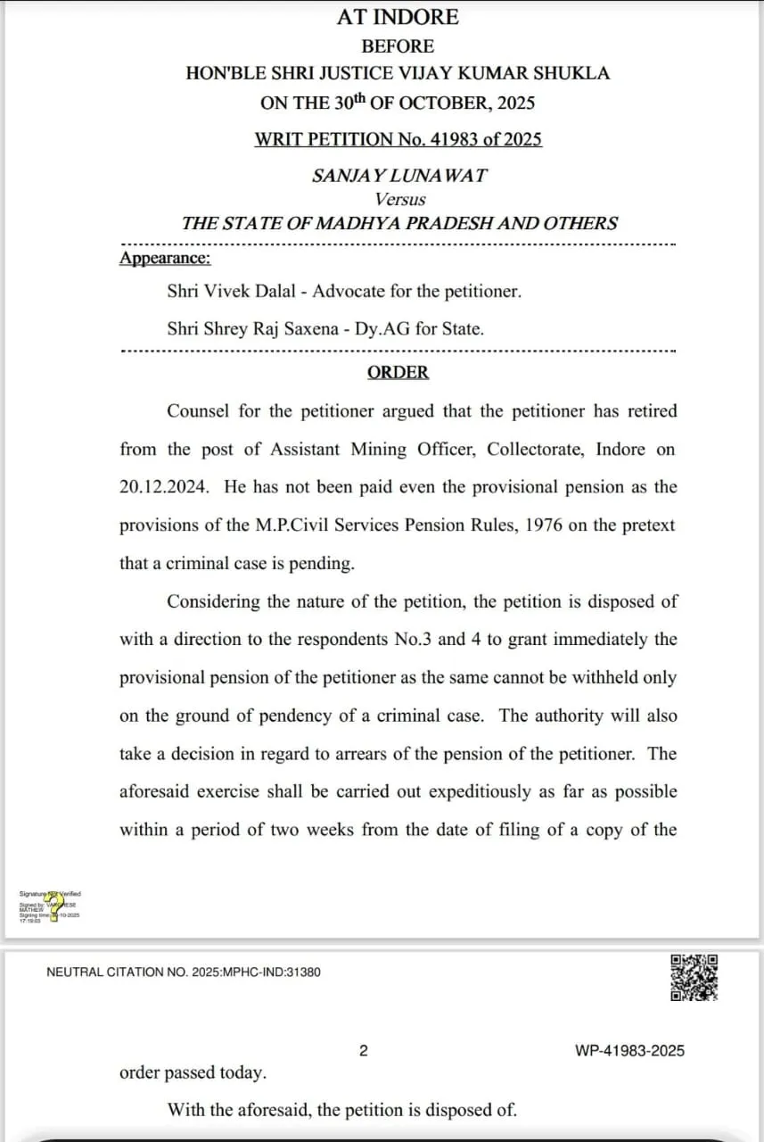 INDORE. विवादित सहायक खनिज अधिकारी संजय लुणावत को पेंशन पर बड़ी राहत मिल गई है। बता दें कि संजय लुणावत ने आरोपों के बाद दिसंबर 2024 में नौकरी से वीआरएस (स्वैच्छिक सेवानिवृत्ति) ले लिया था। गंभीर आरोपों के चलते मप्र शासन ने उनकी पेंशन रोक दी थी। इसके खिलाफ वह हाईकोर्ट इंदौर खंडपीठ में गए थे।