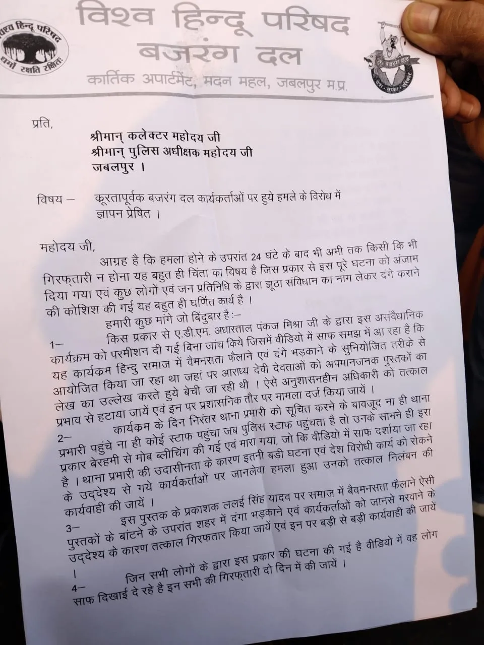 मंगलवार दोपहर ST, SC, OBC संघ, अबाक्स और बहुजन समाज के कार्यकर्ता पुलिस कंट्रोल रूम में ज्ञापन देने पहुंचे। वे आरोप लगा रहे थे कि संविधान की किताब फाड़ने और चेतना सम्मेलन में उपद्रव करने वालों पर पुलिस ने कार्रवाई नहीं की। इसके कुछ देर पहले बजरंग दल ने पुलिस अधीक्षक कार्यालय में ज्ञापन सौंपा था। बजरंग दल के कार्यकर्ताओं ने आरोप लगाया कि उन्हें कार्यक्रम में पीटा गया। जब बजरंग दल के कार्यकर्ताओं को पता चला कि हमलावर भी ज्ञापन देने आए हैं तो स्थिति बदल गई।