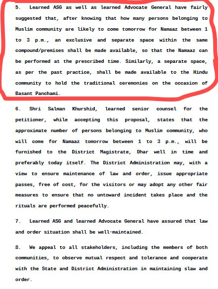 सुप्रीम कोर्ट ने आदेश दिया कि दोपहर 1 से 3 बजे तक नमाज के लिए अलग क्षेत्र मिलेगा। इसी तरह, पिछली प्रथा के अनुसार, बसंत पंचमी पर हिंदू समुदाय को पूजा के लिए अलग स्थान दिया जाएगा। कोर्ट ने दोनों पक्षों से अपील की कि वे आपसी सम्मान बनाए रखें और प्रशासन का सहयोग करें।