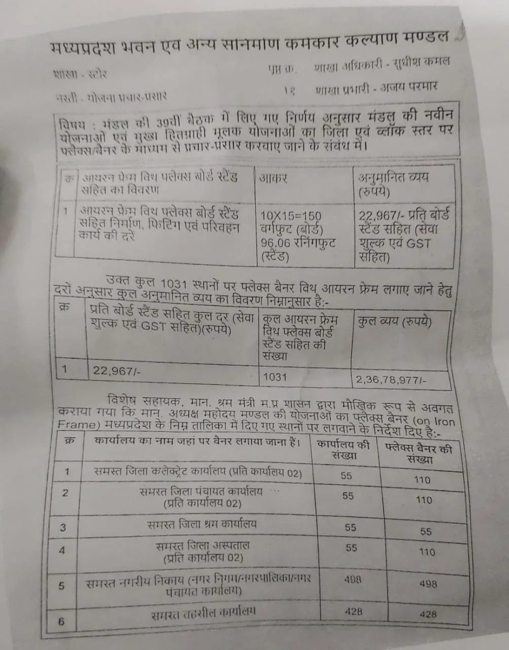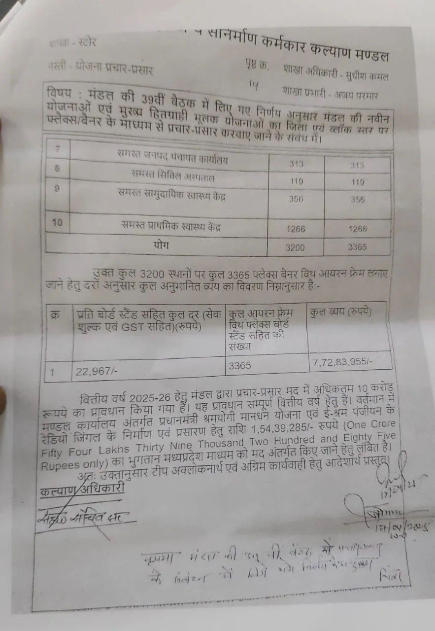 मंडल ने पहले 55 जिलों में 1031 फ्लैक्स के प्रचार पर 2.36 करोड़ रुपए का प्रस्ताव तैयार किया। मध्यप्रदेश माध्यम से दरें भी बुलाई गईं। फिर श्रम मंत्री के विशेष सहायक के हवाले से फ्लैक्स की संख्या 1031 से बढ़ाकर 3365 कर दी गई। इसके साथ बजट भी 2.36 करोड़ से बढ़ाकर 7.72 करोड़ कर दिया गया।