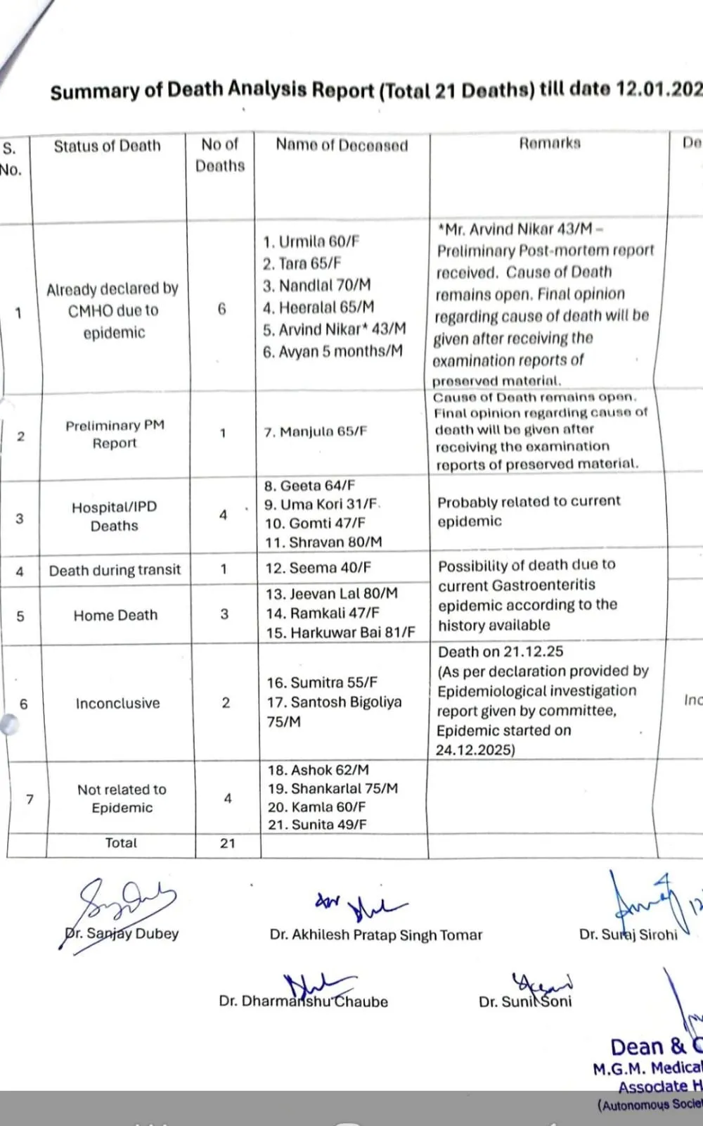 डेथ ऑडिट के तहत 12 जनवरी तक हुई 21 मौतों का एनालिसिस किया गया था। इन्हें अलग-अलग कैटेगरी में बांटा गया है।