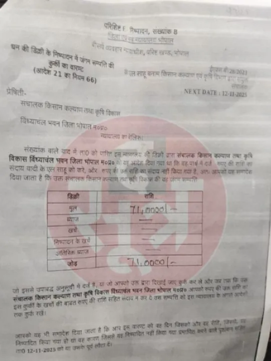 लगातार आदेशों की अनदेखी के बाद भोपाल सिविल न्यायालय ने किसान कल्याण एवं कृषि विकास विभाग के संचालक कार्यालय की संपत्ति कुर्क करने के आदेश जारी किए।