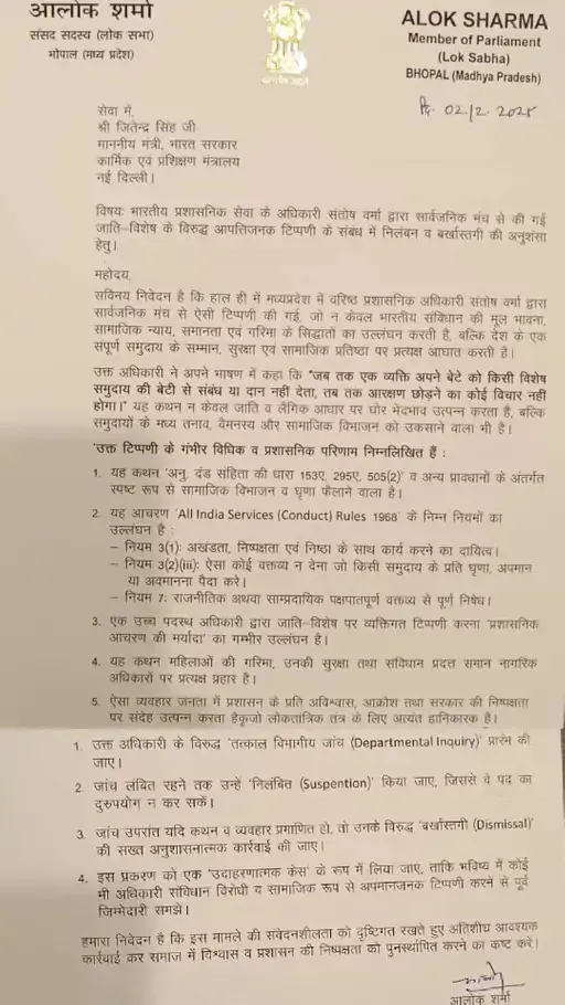 सांसद ने विवादित टिप्पणी पर आईएएस संतोष वर्मा के खिलाफ अनुशासनात्मक कार्रवाई की जाए। अनुसूचित जाति के स्थान पर अनुसूचित जनजाति से चयन की जांच हो। अदालत द्वारा दोषी ठहराए जाने और चयन प्रक्रिया में खामियों के आधार पर वर्मा की पदोन्नति की समीक्षा की जाए।
