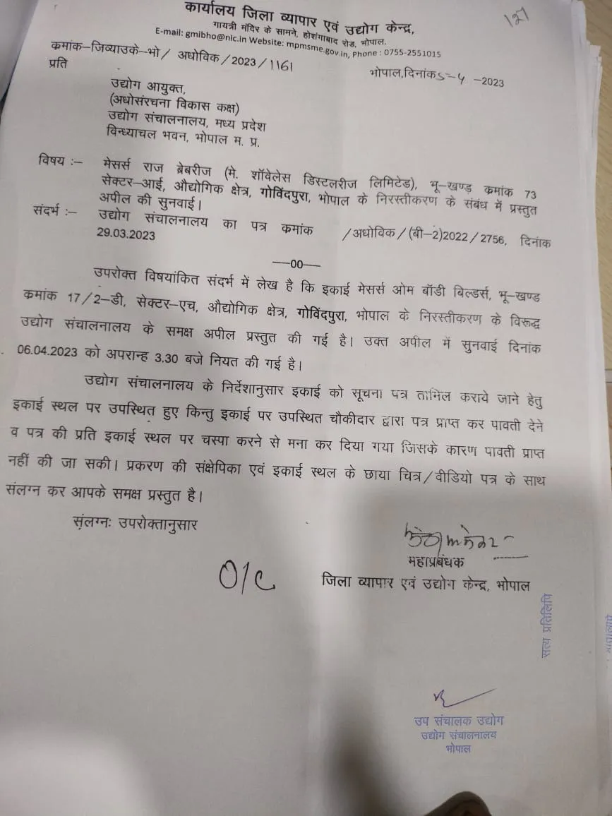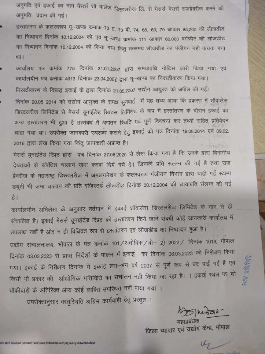 लीज बहाली के तीन माह बाद ही शराब कंपनी ने लीज की जमीन को बेचने की प्रक्रिया शुरू कर दी। इस काम में ​उद्योग विभाग के अफसरों का भी पूरा सहयोग उसे मिला। इसका आकलन इस बात से किया जा सकता है कि 4 जनवरी 2024 को शराब कंपनी की ओर से एक सादा आवेदन जिला उद्योग केंद्र भोपाल के तत्कालीन महाप्रबंधक कैलाश मानेकर को दिया गया।