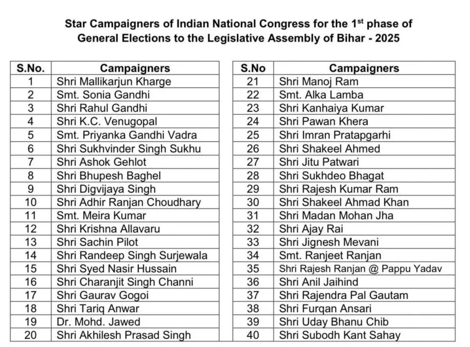 इसके अलावा राजस्थान से पूर्व सीएम अशोक गहलोत और सचिन पायलट का नाम शामिल किया गया है। साथ ही सूची में सोनिया गांधी, मल्लिकार्जुन खरगे, राहुल गांधी और प्रियंका गांधी समेत कई दिग्गज नेताओं का नाम शामिल है।