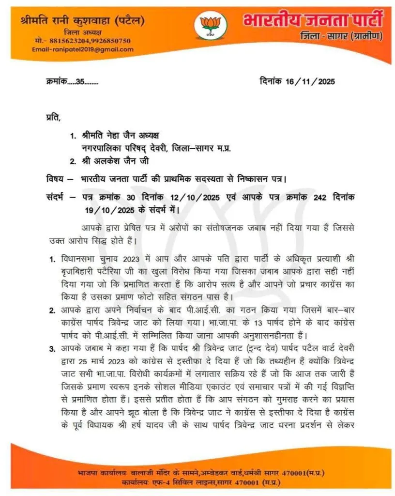 जारी आदेश में कहा गया है कि विधानसभा चुनाव 2023 के दौरान नेहा जैन और उनके पति ने बृजबिहारी पटेरिया का विरोध किया था। इस संबंध में उनसे जवाब मांगा गया था। लेकिन उनका जवाब असंतोषजनक पाया गया। आदेश में कहा गया कि कांग्रेस के समर्थन में उनके प्रचार के प्रमाण संगठन के पास हैं। ये प्रमाण फोटो सहित मौजूद हैं।