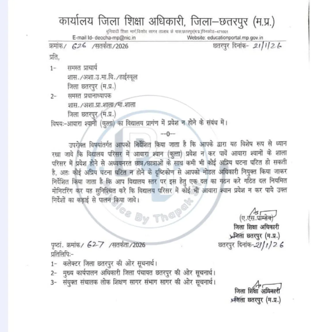 Chhatarpur. मध्य प्रदेश के छतरपुर जिले से एक ऐसी खबर आई है जिसने शिक्षा विभाग में हलचल मचा दी है। बात सुनने में शायद थोड़ी अजीब लगे, लेकिन मामला बच्चों की सुरक्षा से जुड़ा है। अब अगर स्कूल परिसर में कोई आवारा कुत्ता दिखाई दिया, तो उसकी सीधी जिम्मेदारी स्कूल के प्रिंसिपल की होगी। छतरपुर के जिला शिक्षा अधिकारी (DEO) अरुण शंकर पांडे ने एक लिखित आदेश जारी कर सभी सरकारी स्कूलों को अलर्ट मोड पर डाल दिया है।