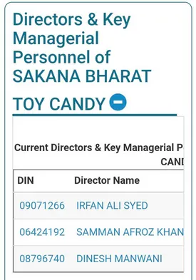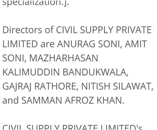 वहीं खान व सिलावट दोनों एक अन्य कंपनी समाइयरा एग्रीफूडस प्रालि में भी एक साथ डायरेक्टर रह चुके हैं। सकाना में विवादित डिब्बा कारोबारी अनुराग सोनी, अमित सोनी भी डायरेक्टर पद पर हैं। एमके बंदूकवाला, गजराज राठौर भी डायरेक्टर पद पर रह चुके हैं।