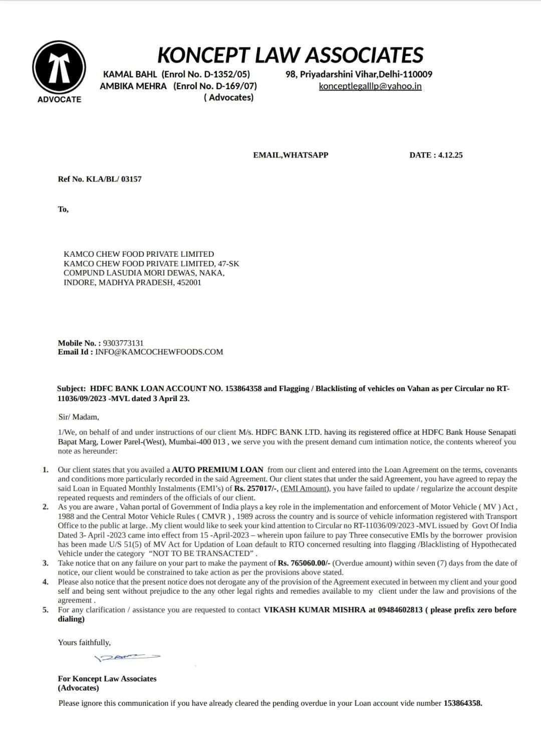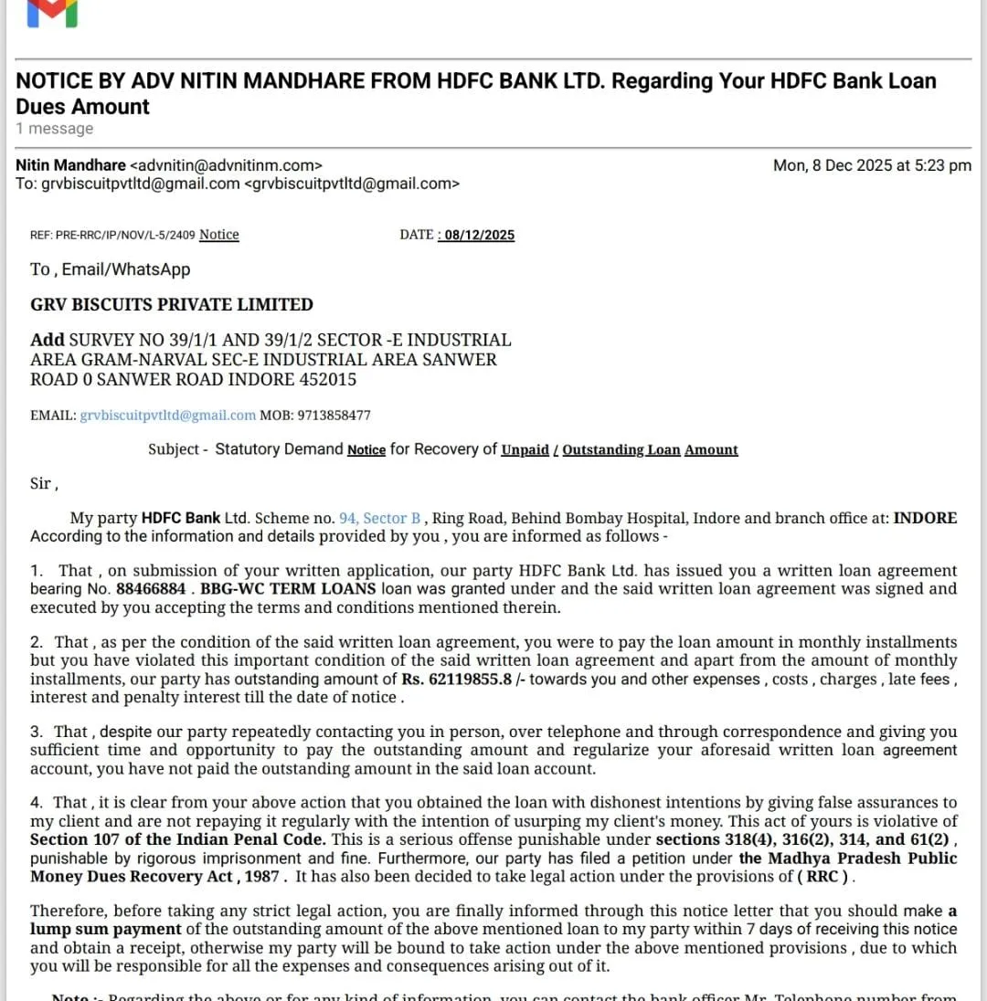 एचडीएफसी बैंक ने केम्को च्यू फूड प्रालि, खालसा, जीआरवी सभी को नोटिस थमाया है। यह नोटिस जीआरवी बिस्किट, संजय कलवानी और एम सिंह ग्रेवाल के नाम जारी हुआ है।