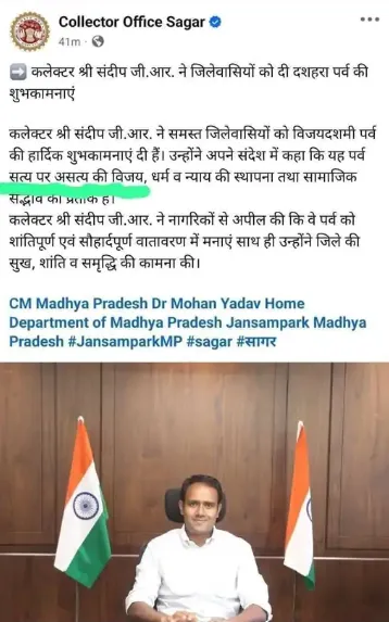 कांग्रेस नेता भूपेंद्र गुप्ता अगम ने सागर कलेक्टर के कार्यालय से किए गए ट्वीट को फेसबुक पर टैग करते हुए एक वीडियो जारी किया। उन्होंने कहा कि सागर के कलेक्टर संदीप जीआर ने जिले की जनता को शुभकामनाएं दी गईं और लिखा गया था कि सत्य पर असत्य की विजय के पर्व पर सभी को बधाई और शुभकामनाएं। गुप्ता ने सवाल उठाया कि क्या व्यवस्था के तहत कलेक्टर के मुंह से सत्य की बात निकली है, या फिर यह एमपी की हालत हो चुकी है, जहां सत्य पर असत्य की विजय का उत्सव मनाया जा रहा है।