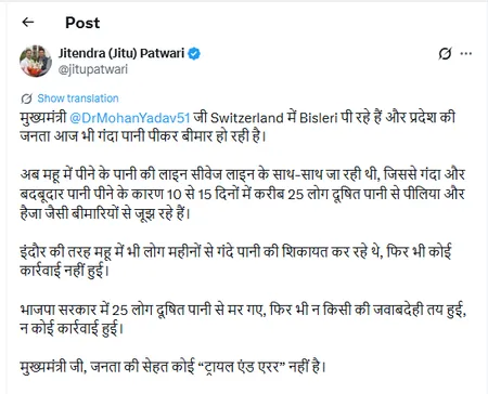 एमपी कांग्रेस अध्यक्ष जीतू पटवारी ने अपने X अकाउंट पर पोस्ट कर लिखा है कि, मुख्यमंत्री स्विट्जरलैंड में बिसलरी पी रहे हैं, जबकि प्रदेश की जनता गंदा पानी पीकर बीमार हो रही है।