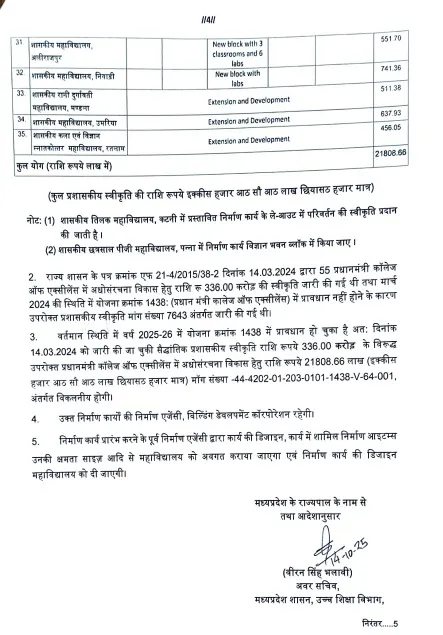 तिलक कॉलेज कटनी में नए ब्लॉक और तीन स्किल लैब के साथ तीन अतिरिक्त लैब और सात स्नातक कक्षों का निर्माण कराया जाएगा। पीजी कॉलेज धार में दो पुराने कक्ष और तीन लैब का जबकि पीजी कॉलेज झाबुआ में चार कक्ष और 8 प्रयोगशालाओं का एक्सटेंशन होगा। इसके अलावा नवीन पीजी कॉलेज शाजापुर में दो ब्लॉक, एक सेमिनार हॉल, तीन लैब और आठ नए कक्ष बनाए जाएंगे।