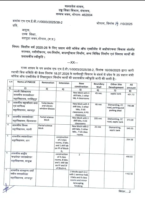 BHOPAL. मध्य प्रदेश के 35 पीएमश्री कॉलेजों पर दिवाली से ठीक पहले उच्च शिक्षा विभाग ने धनवर्षा की है। कॉलेजों को भवन की मरम्मत, नवीनीकरण, नए निर्माण, सुरक्षा दीवार सहित अन्य कामों के लिए 218 करोड़ से ज्यादा का बजट दिया गया है। इनमें कुछ कॉलेज वे भी हैं जो केंद्र की पीएम ऊषा योजना के तहत 2024 में मिले पांच- पांच करोड़ रुपए अब तक खर्च नहीं कर सके हैं। सरकार के करोड़ों रुपए दबाए बैठे ऐसे ही कॉलेजों को स्थायी वित्त समिति ने फिर करोड़ों का बजट सौंप दिया है।