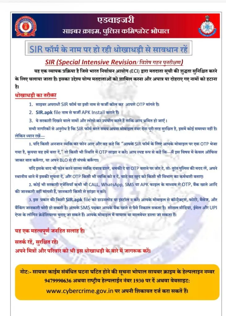 पुलिस की एडवाइजरी में कहा गया है कि SIR फॉर्म में मोबाइल नंबर देना सुरक्षित है। अनजान कॉल, व्हाट्सऐप या SMS पर OTP न बताएं। यदि कॉल करने वाला दबाव बनाए या डराए, तो तुरंत थाने को सूचित करें।