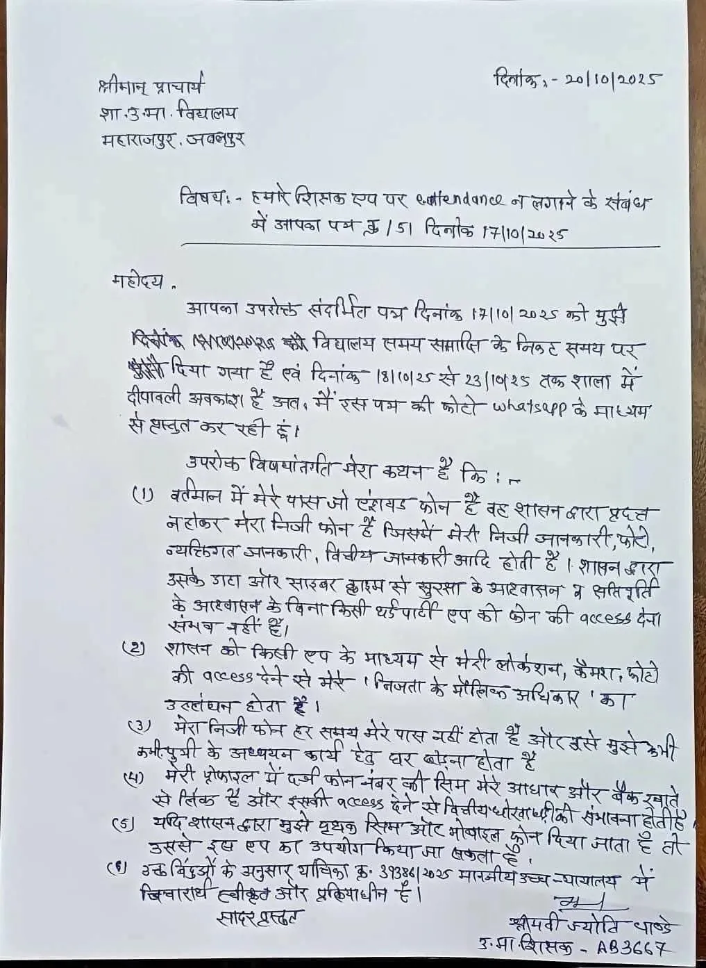 सरकारी स्कूल की शिक्षिका ज्योति पांडे ने अपने प्राचार्य को दिए जवाब में लिखा कि वे अपने निजी मोबाइल फोन में ई-अटेंडेंस ऐप डाउनलोड नहीं कर सकतीं क्योंकि फोन में उनकी निजी जानकारी, बैंक विवरण, फोटो और लोकेशन डेटा मौजूद है।