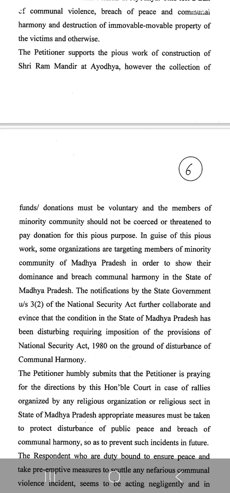 सिंह ने याचिका में इंदौर, उज्जैन और मंदसौर में दिसंबर 2020 के दौरान हुई घटनाओं के उदाहरण दिए हैं। उन्होंने एफआईआर और अन्य प्रमाणों के साथ आरोप लगाए हैं। सिंह ने कहा है कि श्रीराम मंदिर के पवित्र निर्माण कार्य के दौरान दान संग्रह किया गया। इस दौरान कुछ संगठनों के जरिए इंदौर, उज्जैन व मंदसौर में इसकी आड़ में सांप्रदायिक हिंसा की घटनाएं हुईं।