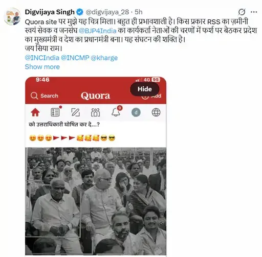 दिग्विजय सिंह ने लिखा, "RSS का जमीनी स्वयंसेवक और बीजेपी का जमीनी कार्यकर्ता नीचे बैठकर सीएम और पीएम बना... यह संगठन की शक्ति है।" इस पोस्ट में दिग्विजय सिंह ने मोदी की तारीफ की। साथ ही बीजेपी और RSS के संगठन की ताकत को भी उजागर किया।