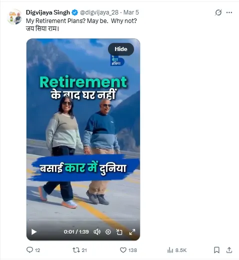 पूर्व मुख्यमंत्री और सांसद दिग्विजय सिंह ने एक्स पर एक वीडियो शेयर किया है। इसमें उन्होंने अपना रिटायरमेंट प्लान बताया है। दिग्विजय ने एक्स पर रिटायरमेंट के बाद भारत यात्रा करने निकले सेवानिवृत्त बैंक अधिकारी शिवानंद भंजा का वीडियो पोस्ट किया है।
