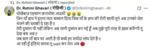 रोहिणी ने लिखा है, जिन मां-बाप ने प्यार और सम्मान दिया, उन्हें तू अब जेल भेजने की धमकी दे रहा है। तेरी दुश्मन नहीं थी, अब जानी दुश्मन बन गई हूं। अब तुझे पूरी तरह से खत्म करूंगी। जब बात मां-बाप की आती है, तो बच्चे हर मर्यादा लांघ देते हैं। मैं इंडिया वापस आ रही हूं, तू इंतजार कर।