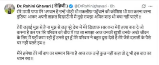 तीन दिन पहले रोहिणी ने चंद्रशेखर को चुनौती दी। उन्होंने लिखा, मेरे मम्मी-पापा मेरे भगवान हैं। उनको तकलीफ पहुंचाने की कोशिश मत करना। वरना इंडिया आकर अपनी ताकत दिखाऊंगी। अमित शाह भी बचा नहीं पाएंगे। तेरी लड़ाई मुझसे है, मुझसे लड़। मेरे खिलाफ FIR कर, हत्या करा दे, जो करना है कर। मेरे परिवार को बीच में मत ला।