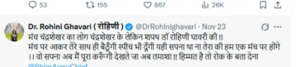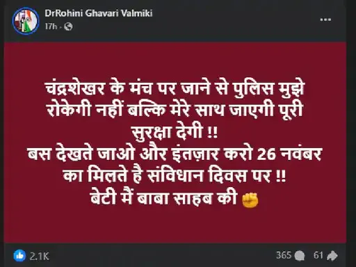 रोहिणी ने लिखा, चंद्रशेखर के मंच पर जाने से पुलिस मुझे नहीं रोकेगी। पुलिस मेरे साथ जाएगी और पूरी सुरक्षा देगी। बस देखते जाओ और 26 नवंबर का इंतजार करो। मिलते हैं संविधान दिवस पर। बेटी मैं बाबा साहब की।
