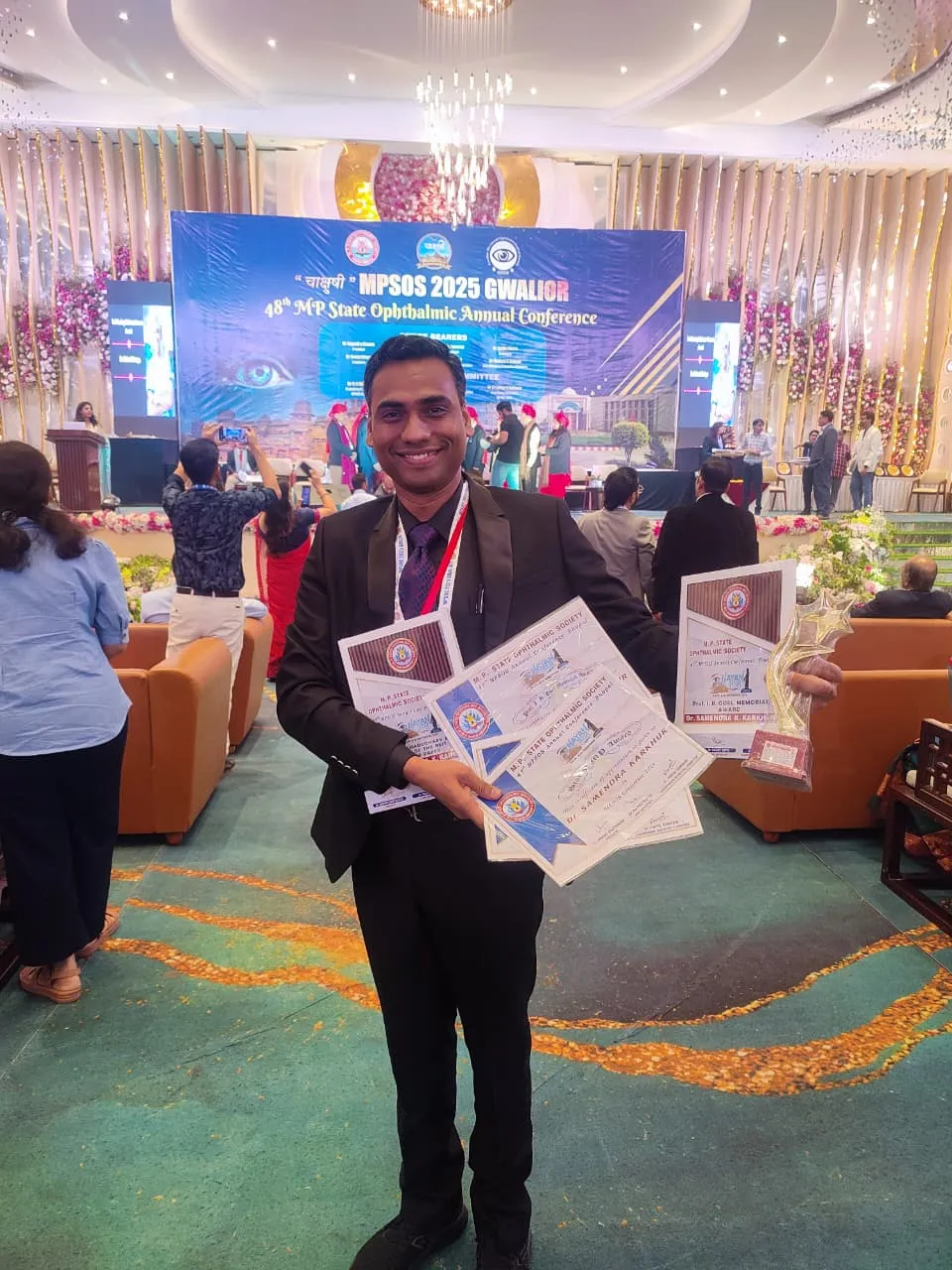 GWALIOR. ग्वालियर में 3 से 5 अक्टूबर 2025 तक आयोजित मध्यप्रदेश स्टेट ऑप्थल्मिक सोसाइटी के वार्षिक सम्मेलन में डॉ. समेंद्र कारखुर ने एक अद्वितीय उपलब्धि हासिल की। उन्होंने सम्मेलन में भाग लेने वाले वैज्ञानिकों में से तीन हाई स्टैंडर्ड के पुरस्कारों को जीतकर सभी को चौंका दिया।