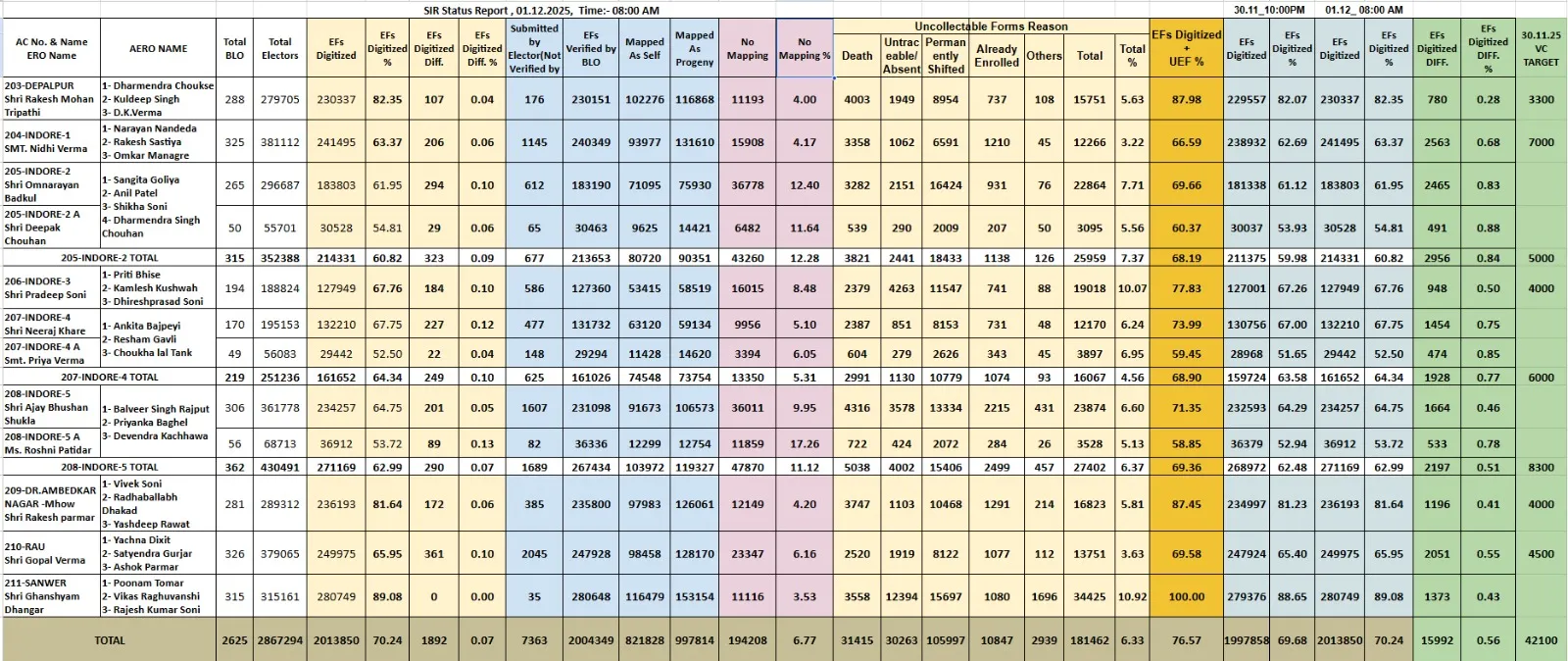 इसका नतीजा यह हुआ कि इंदौर में 77 फीसदी काम हो चुका है। इंदौर के 20 लाख मतदाताओं का गहन पुनरीक्षण किया जा चुका है।